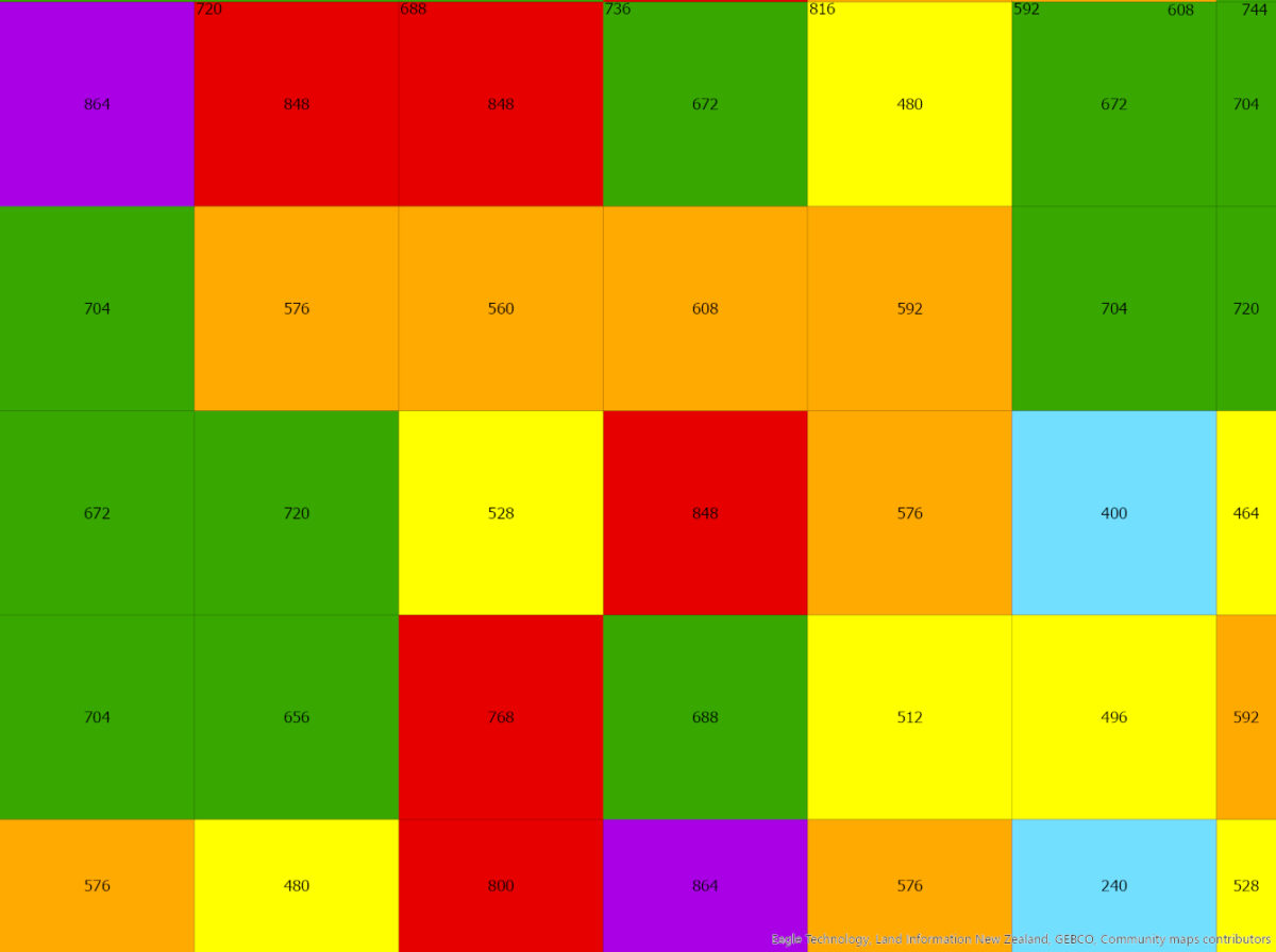 This example shows low, medium, high stocking with an estimate of the total trees per grid cell (25x25m) and an estimate of the tree to be removed to meet the thinning prescription shown in brackets.