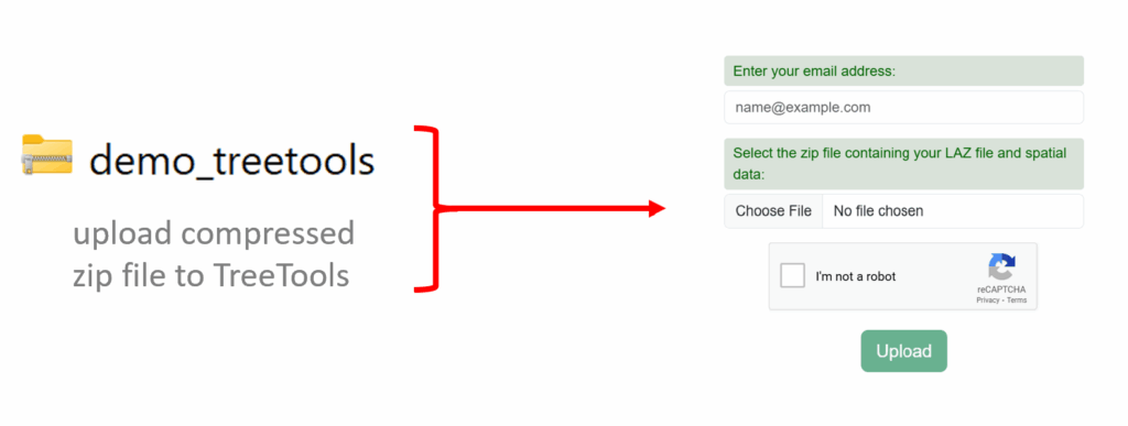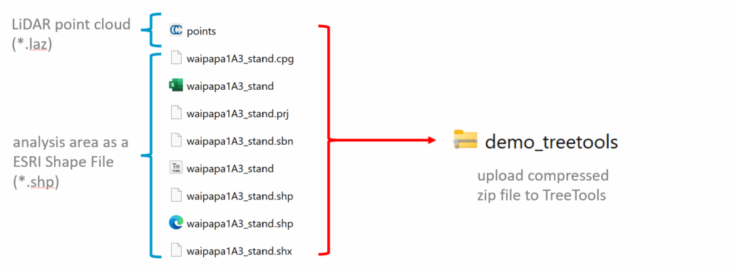 Data is uploaded to TreeTools as a compressed zip file (*.zip). Note the area of interest (AOI) is typically a stand boundary.