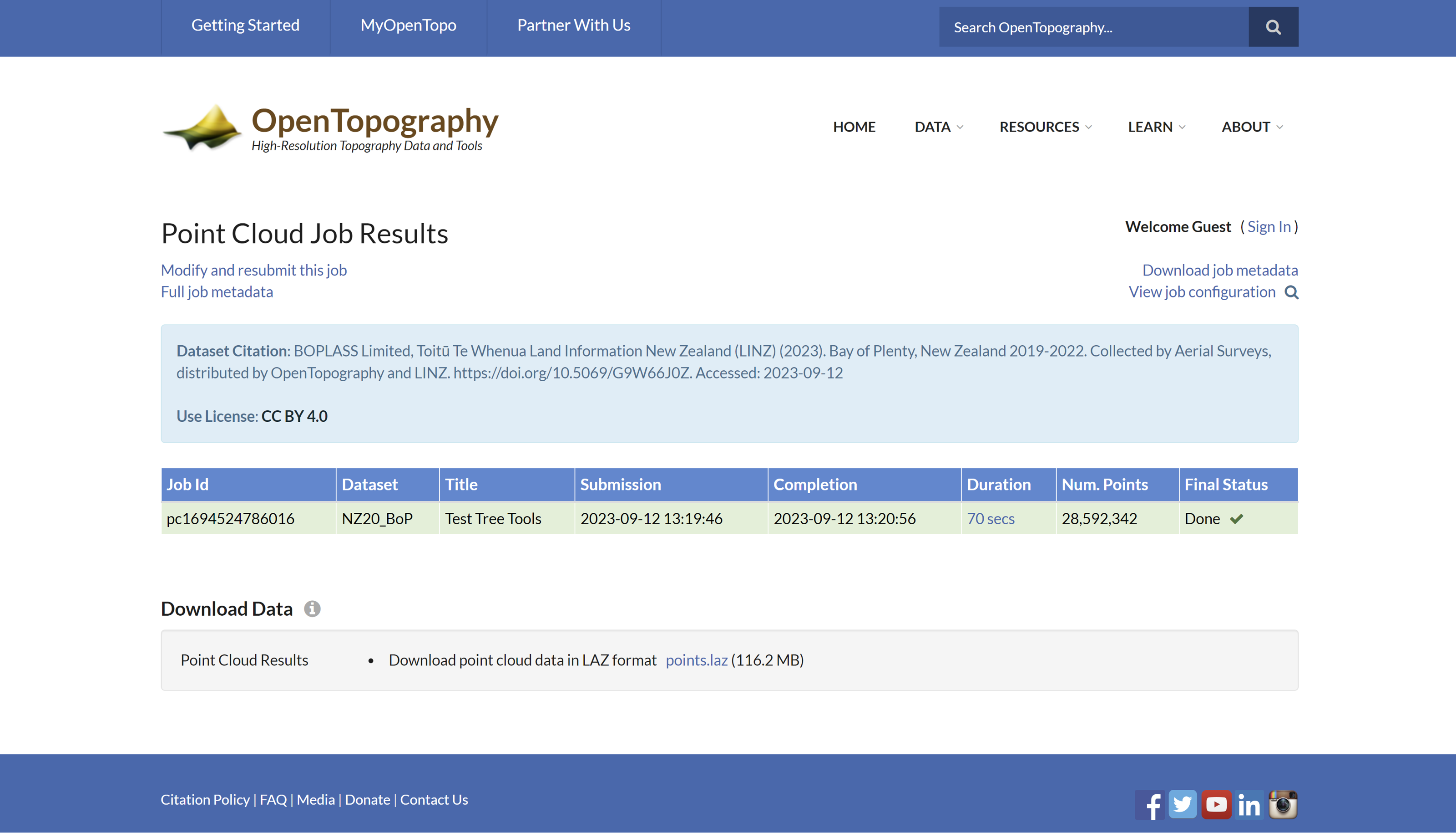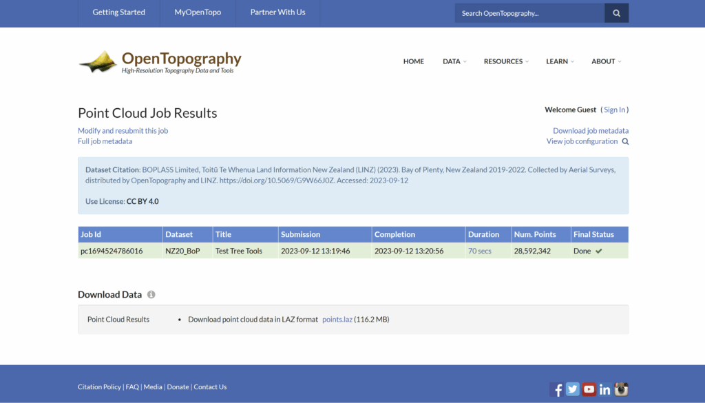 Once ready, Open Topography will provide you with a link to the LiDAR point cloud file as a “points.laz” file.